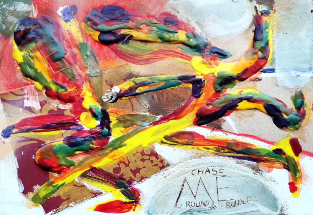 Chase Me Round & Round Chase Me Round & Round pt.2 see pop-up book in motionand hear the story narrated Jan. – Feb. 2022 Chase Me Round & Round_encaustic painting Feb. 2022